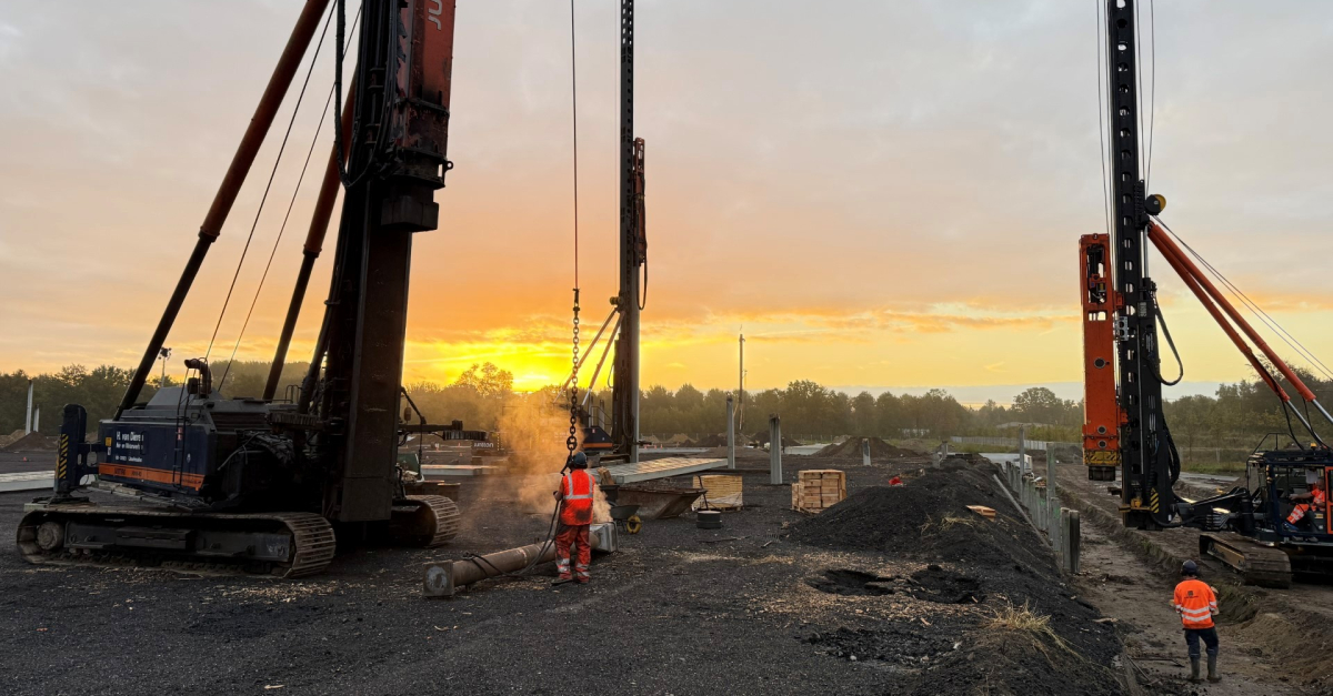 Het grondwerk is inmiddels volledig afgerond en ook het riool ligt er voor het grootste deel in. De heiwerkzaamheden naderen hun voltooiing: dagelijks worden er maar liefst 200 VSD-palen de grond in gebracht. Daarmee bereiden we ons voor op de volgende fase: in november start de montage van de staalconstructie. Begin 2026 zal KWS starten met de verharding van de parkeerplaats.